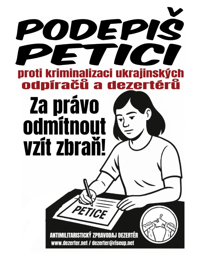 📢Podepište online petici (Odkaz zde: https://www.petice.com/petice_za_pravo_ukrajinc_odmitnout_valku). Podpis je anonymní, a nebude vidět. Petice je součástí naší Kampaně solidarity s ukrajinskými odpírači a dezertéry. Ukrajinská vláda připravuje zákon č. 13673, který kriminalizuje každého, kdo utekl před mobilizací. Každému, kdo se nechce vrátit do zákopů, hrozí vězení, deportace a násilné odvedení do armády. Ukrajinští dezertéři a odpírači vojenské služby potřebují naši solidaritu. Podpořte právo žít, právo nebýt poslán na frontu proti své vůli, právo odmítnout stát a jeho válku.