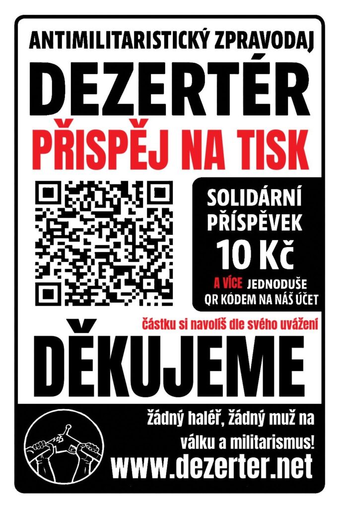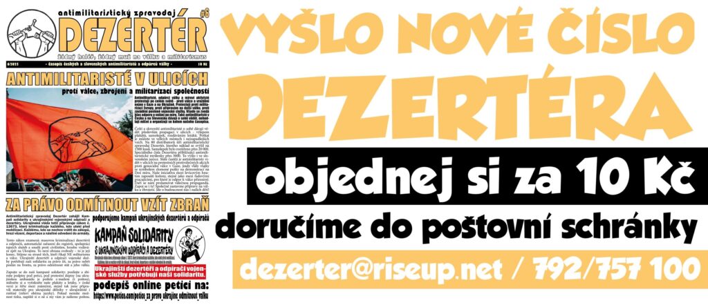 Vyšlo letošní poslední šesté číslo dvacetistránkového antimilitaristického zpravodaje Dezertér. Solidární cena 10 Kč na pokrytí nákladů na tisk. Časopis je možné si objednat za 10 Kč v místech, kde máme lokálního distributora či distributorku, který jej doručí do tvoji poštovní schránky. Kde jej zatím nemáme, je nutné připočíst poštovné 40 Kč. Seznam najdeš zde: https://dezerter.noblogs.org/distribucni-mista/