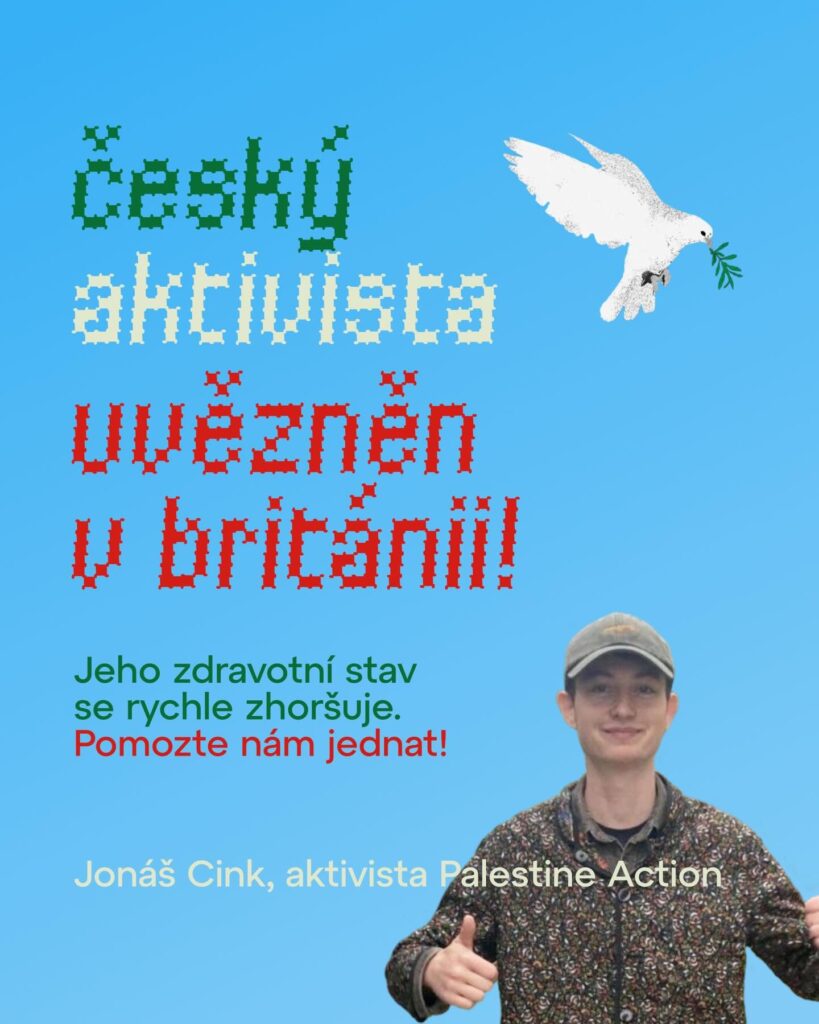 Jonáš Cink, aktivista Palestine Action, je ve Velké Británii držen ve vazbě. Jeho zdravotní stav se zhoršuje. Připojte se k výzvě Sdružení přátel Palestiny, napište české vládě a přijďte ho podpořit na sobotní pochod solidarity.
