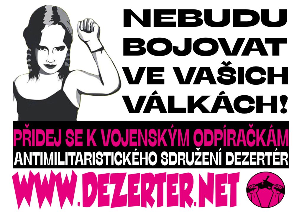 V Česku se mobilizace v případě války týká také žen ve věku 18-60.let. Odmítněte být vojačky, masem pro jejich války! Řekněte spolu s námi: „Nebudu bojovat ve vašich válkách!“ Přidej se k vojenským odpíračkám Antimilitaristického sdružení Dezertér.