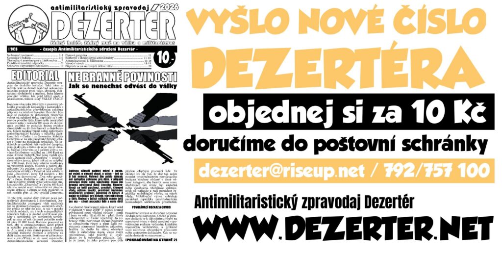 Vyšlo letošní první číslo dvacetistránkového antimilitaristického zpravodaje Dezertér. Solidární cena 10 Kč na pokrytí nákladů na tisk. Časopis je možné si objednat za 10 Kč v místech, kde máme lokálního distributora či distributorku, který jej doručí do tvoji poštovní schránky. Kde jej zatím nemáme, je nutné připočíst poštovné 40 Kč. Seznam najdeš zde: https://dezerter.noblogs.org/distribucni-mista/