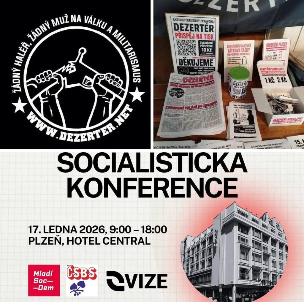 📢Zítra 17.ledna nás od 9:00 najdete se stánkem na Socialistické konferenci v Plzni v hotelu Central. Na místě bude nové číslo antimilitaristického zpravodaje Dezertér 1/2026, ale seženete i všechna starší čísla. 🔴Na místě bude možné vyplnit formuláře pro odmítnutí vojenské služby a vstup do našeho Antimilitaristického sdružení Dezertér.