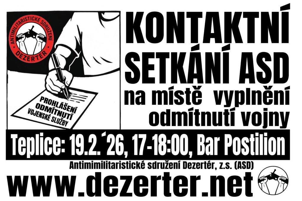 Chceš odmítnout vojenskou službu v případě mobilizace do války? Není na tom nic složitého, stav se dnes pro potřebné formuláře k odmítnutí vojenské služby. Náš člen ti na místě pomůže s vyplněním a vysvětli vše co je potřebné. Na místě také aktuální číslo našeho časopisu Dezertér za 10 Kč.