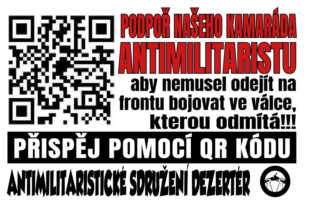 Příspěvky posílejte ve prospěch účtu Dezertéra: 7123630004/5500 (do poznámky napište „kamarád“) nebo pohodlně qr kódem, částka je nastavená na 150 Kč, lze ji upravit dle svého uvážení. Pomozte nám v peněžní sbírce na uhrazení výdajů spojených s vyřízením úředních záležitostí našeho antimilitaristického kamaráda, aby mohl zůstat v Česku a nebyl odveden do války na Ukrajině. Náš kamarád je volyňský Čech, ale má ukrajinský pas, kterému prošla platnost. V Česku žije bezmála 30 let a odmítá být masem pro děla ve válce! Bez platného pasu nemůže legálně pracovat, ačkoli má zde trvalý pobyt! Na ukrajinském velvyslanectví ani na ministerstvu mu nepomohli, vlastně jej chtějí donutit si jít vyřídit pas na Ukrajinu. To by však znamenalo, že bude hned na hranicích zatčen, proti své vůli odveden do armády a pak rovnou na válečná jatka. Rozhodli jsme se mu pomoci s vyřízením žádosti o české občanství v rámci repatriace jako volyňského Čecha. Jelikož v současné době musel v dosavadní práci skončit, aby jeho firma neriskovala zaměstnávání na černo, a na sociální podporu nemá nárok, je v značné finanční tísni. Obracíme se proto na všechny skutečné odpůrce války a antimilitaristy, aby nám pomohli se shromážděním potřebných peněz na úřední poplatky, cestovné a korespondenci spojenou s vyřízením jeho žádosti. Každá částka pomůže a předem si vaší projevené solidarity velice vážíme.